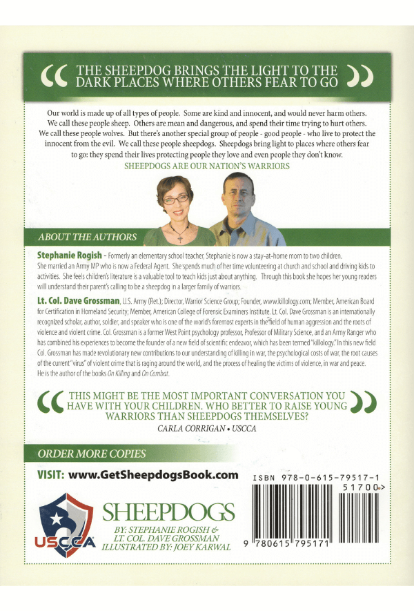 Co-author Stephanie Rogish is an elementary teacher, she has tested the book down to kindergarten level, and even they are impacted by this powerful book. For teens, the book also has a great impact with deeper levels of information, and they can roll right into the original, viral, “Sheep, Wolf and Sheepdog” extract from On Combat, which is included in the back of the book.